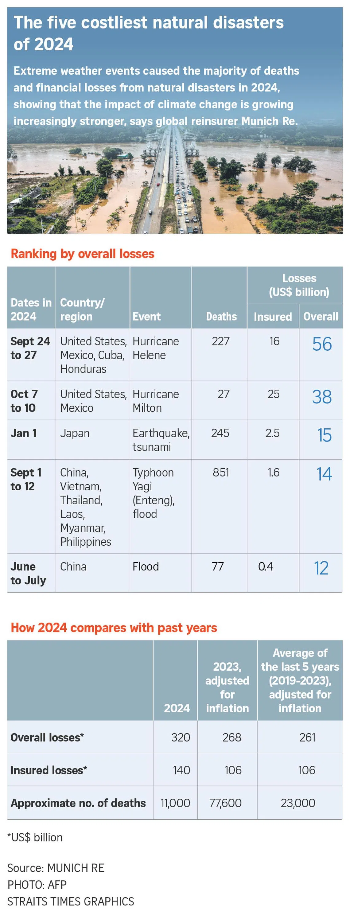 SINGAPORE - Natural disasters caused US$320 billion (S$438.6 billion) in overall losses in 2024, as climate change fuels increasingly more destructive weather around the globe, reinsurance giant Munich Re said on Jan 9.