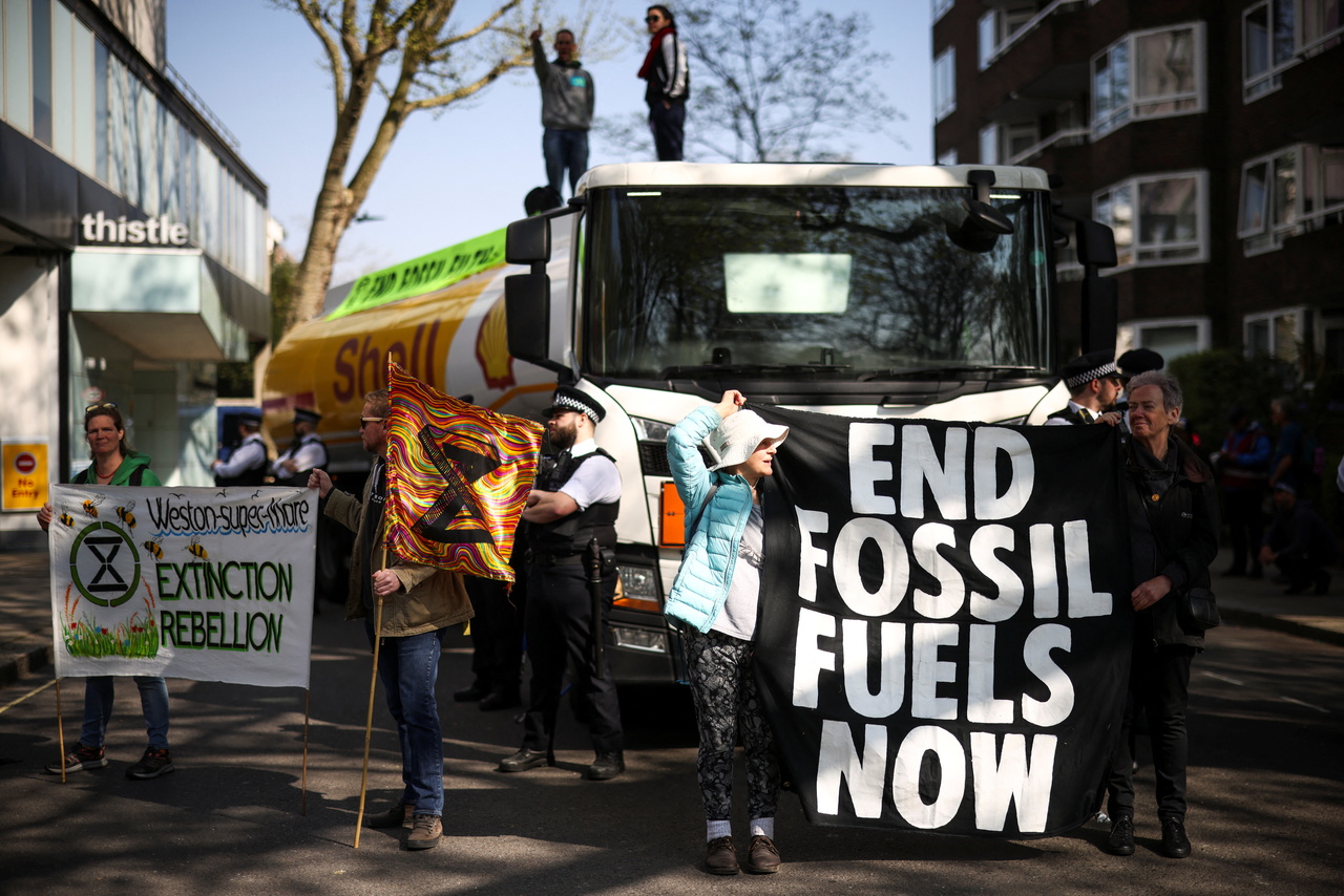 Activists from Extinction Rebellion occupy an oil tanker during a protest in London, on April 16, 2022.