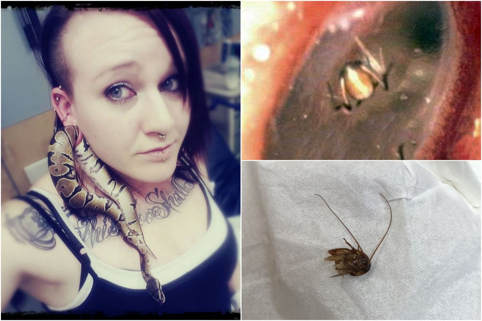 Ms Ashley Glawe's pet python was stuck in her ear gauge (left), a spider wove a web deep inside a Chinese woman's ear canal (top right), and doctors removed a cockroach from Ms Katie Holley's ear.