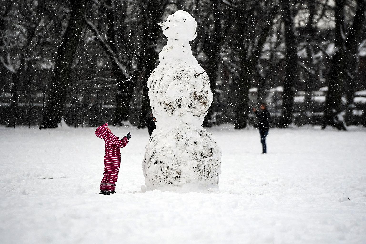A child looking at a giant snowman in snow-covered Victoria Park in Glasgow last Tuesday.