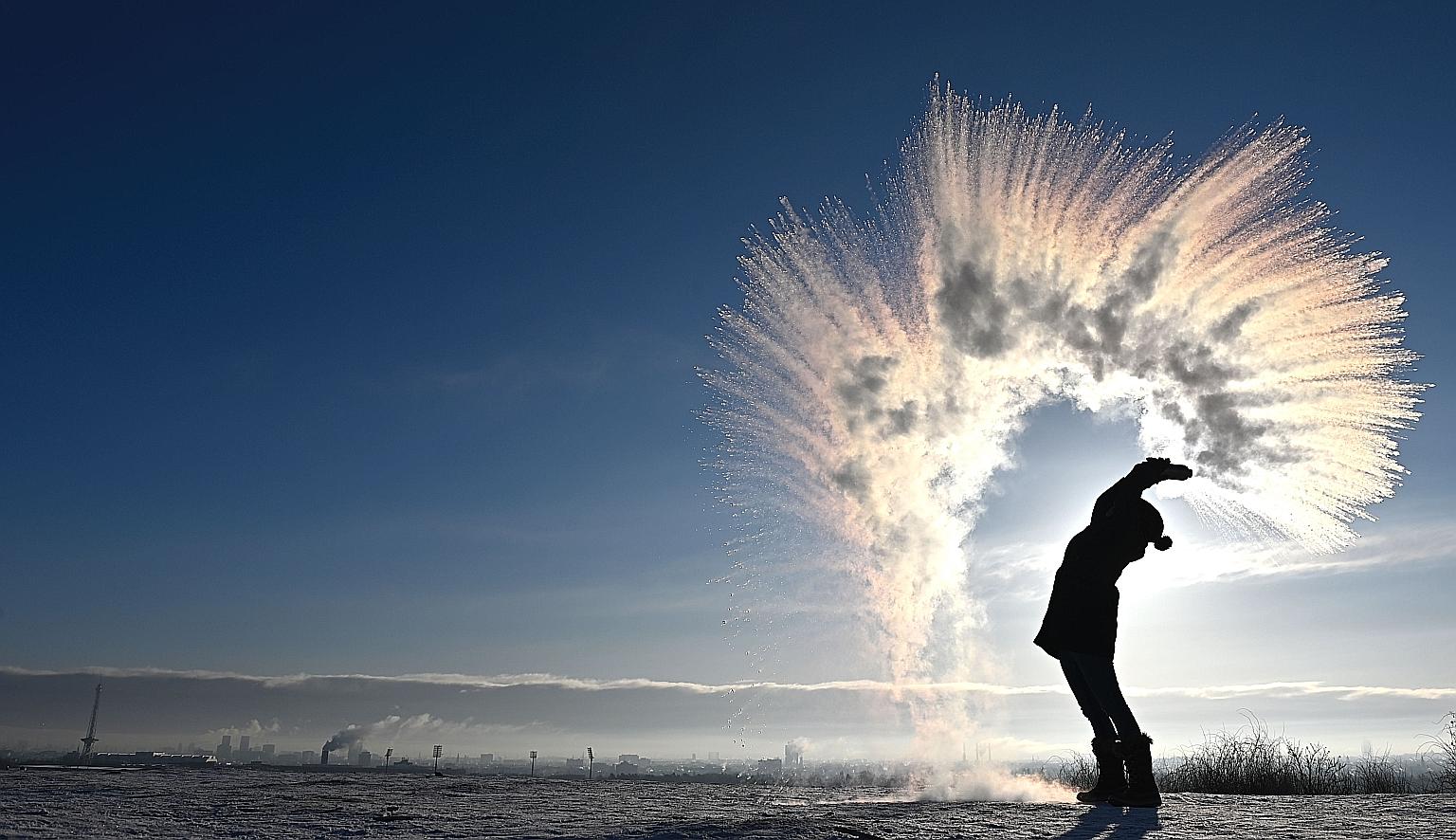A woman throwing hot water into the cold air to produce the so-called "Mpemba effect" at Berlin's Drachenberg (dragon's hill) on Saturday.