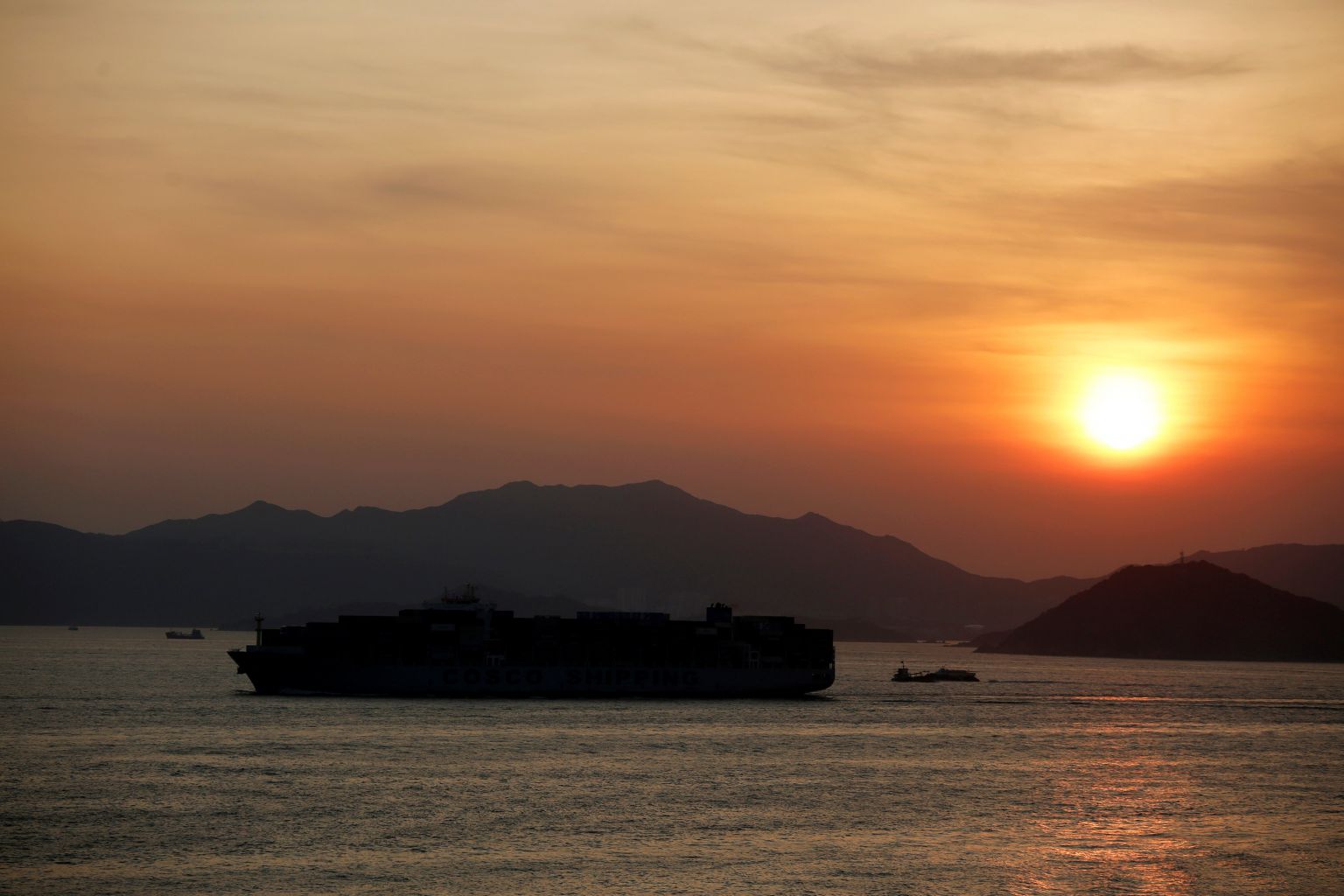 A container ship sails at sunset in Hong Kong. A rule to combat the merchant fleet's emissions of sulfur oxides starting in January 2020 could slow down ships in a few years.