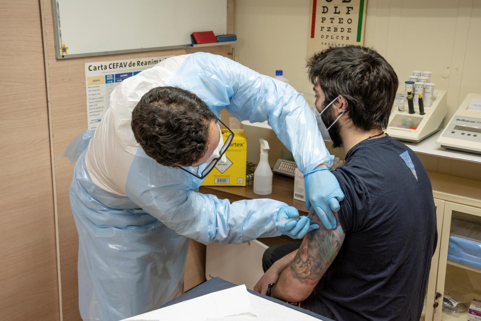 A healthcare worker administers a dose of Sinovac's CoronaVac vaccine at a care center in Antarctica, Chile, on March 14, 2021.