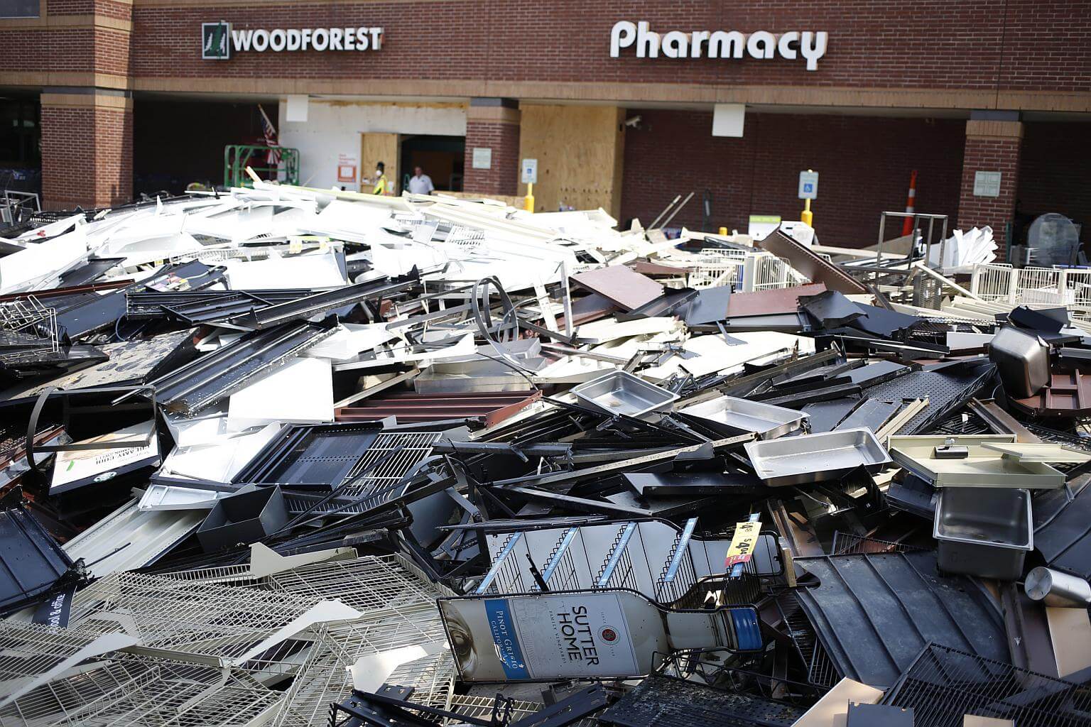 Piles of damaged store shelving sits in the parking lot outside a Kroger Co grocery store that was flooded after Hurricane Harvey in Texas, on Sept 6, 2017.