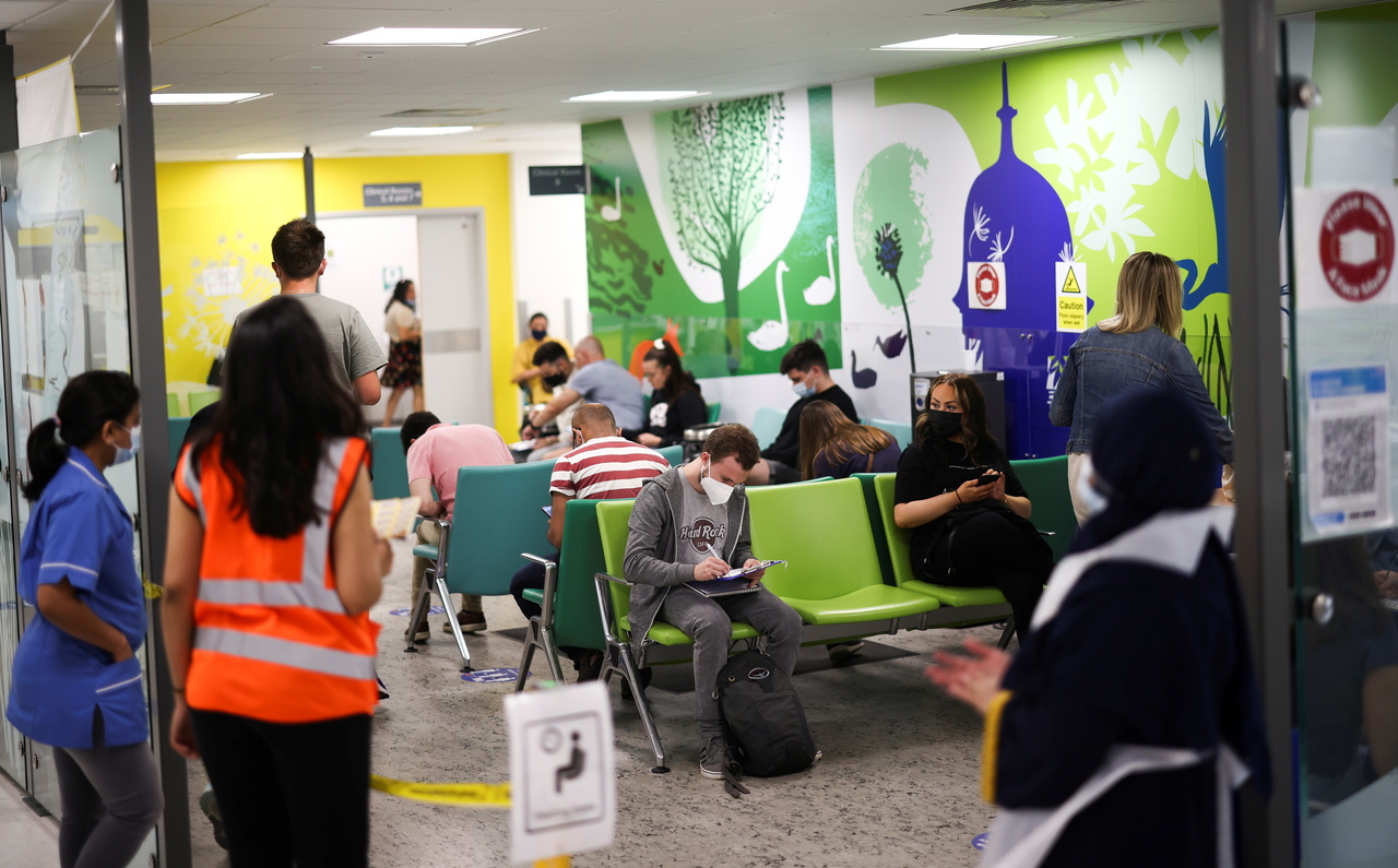 People sit in a waiting room ahead of receiving a dose of the Covid-19 vaccine at a hospital in London, on Aug 1, 2021.