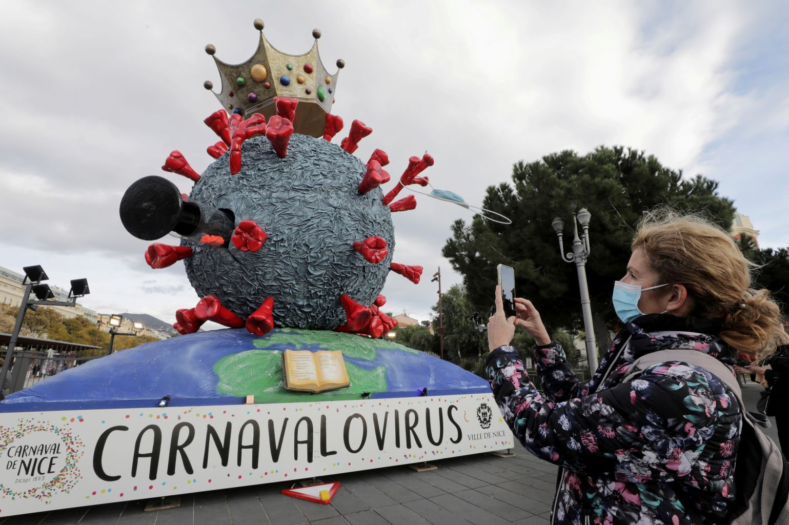 A woman takes a photo of a carnival float depecting the novel coronavirus in Nice, France, on Feb 16, 2021.