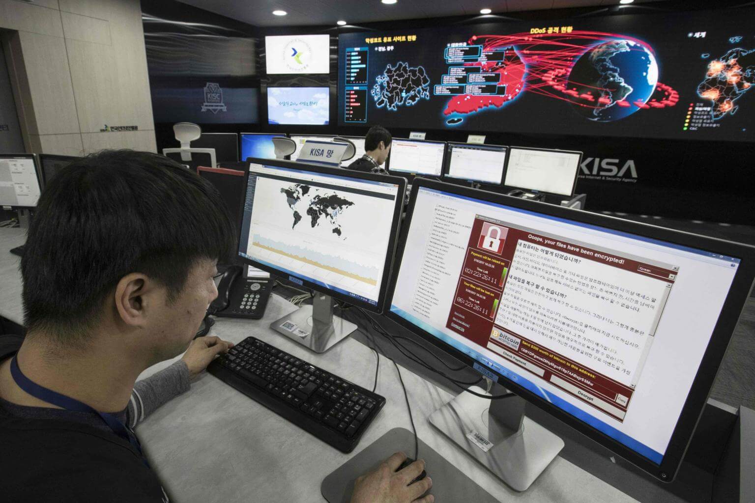 Staff monitoring the spread of ransomware cyber-attacks at the Korea Internet and Security Agency (KISA) in Seoul, on May 15, 2017.