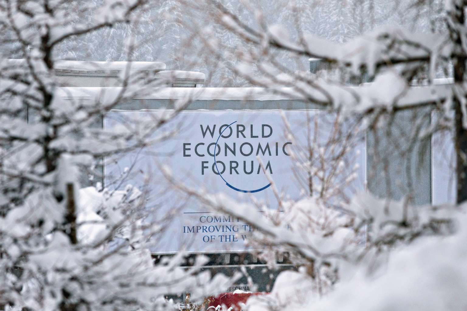 A sign for the World Economic Forum annual meeting sits on display among snow covered trees in Davos, Switzerland on Jan 14, 2017.