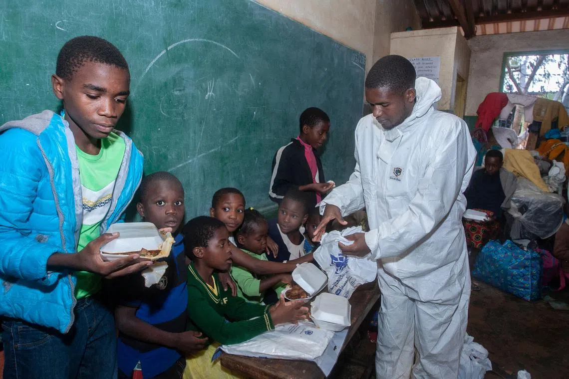 A relief worker distributing relief food to children at Chilobwe township’s Naotcha Primary school camp.