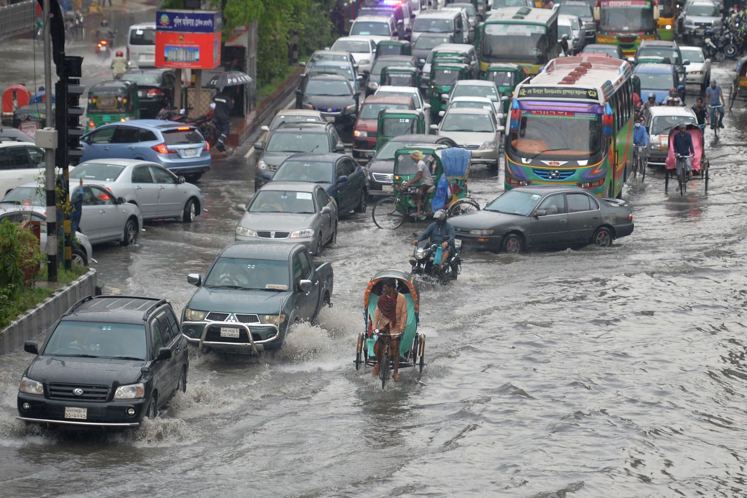Motorists make their way through a waterlogged street after a heavy downpour in Dhaka, Bangladesh.