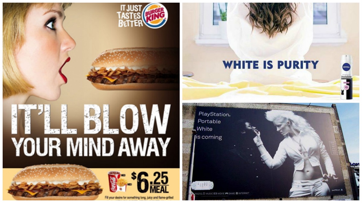 (Clockwise from left) Burger King's sexually suggestive ad, Nivea's Middle East "racist" White Is Purity ad, and PlayStation's "racist" PlayStation Portable White ad.