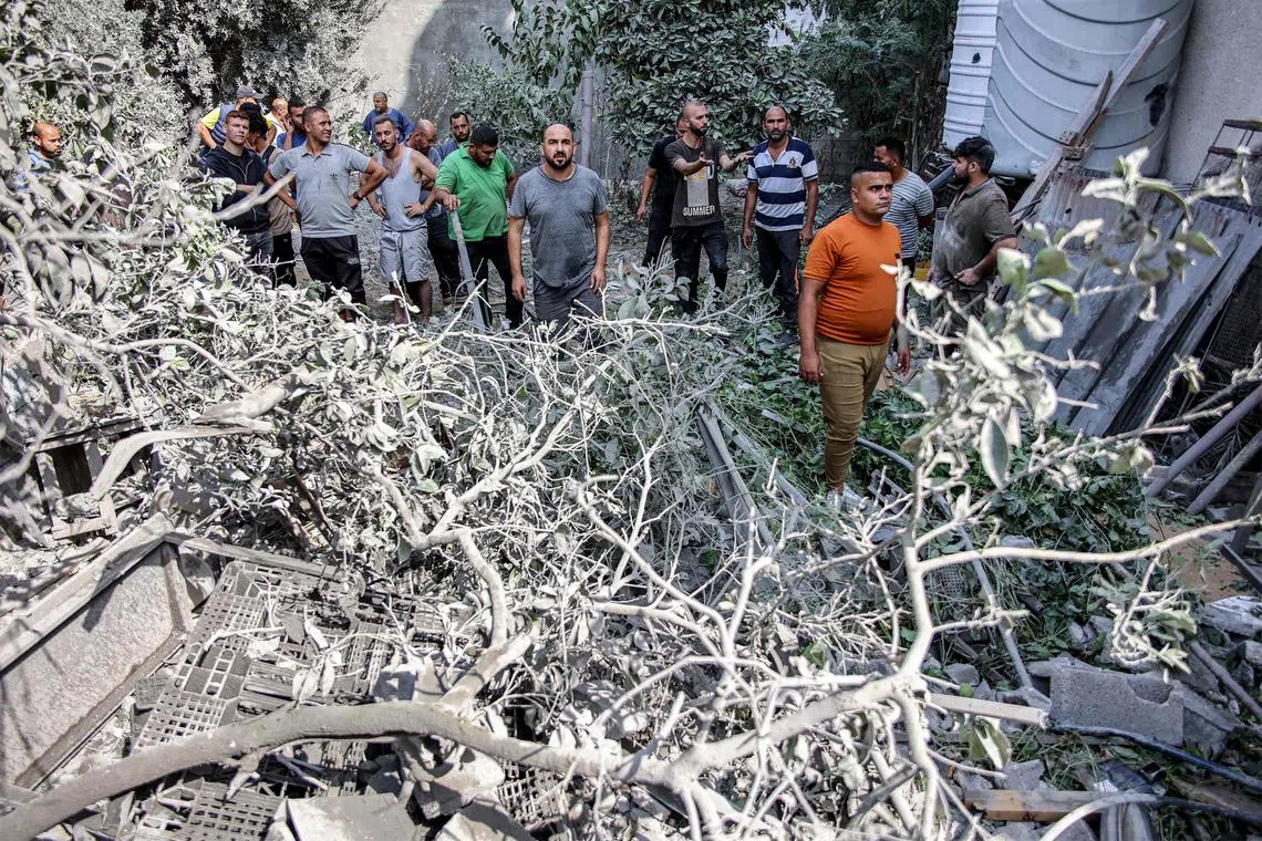 People gather outside a collapsed building following Israeli bombardment in the Saftawi district in Jabalia, in the northern Gaza Strip, on Oct 15.