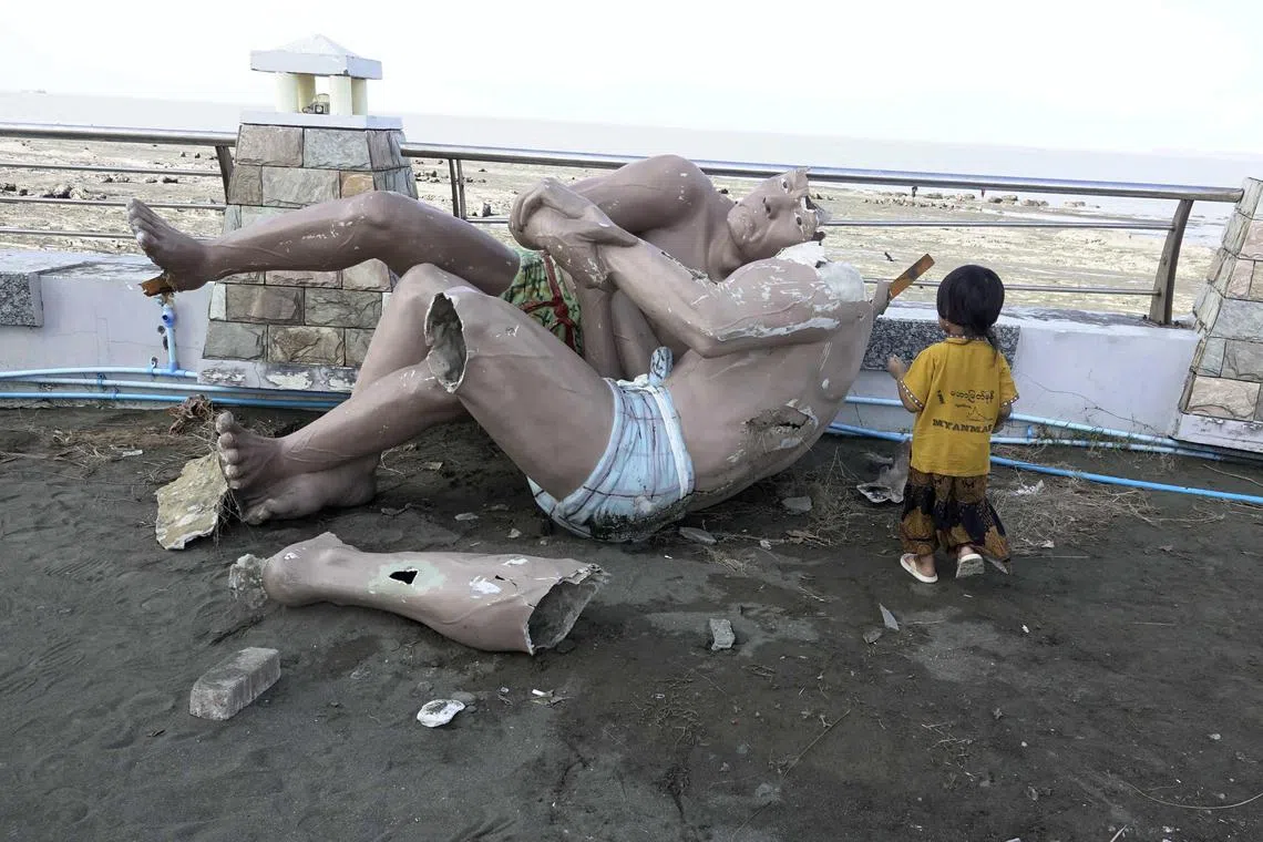 A girl playing near a damaged sculpture in Sittwe, Myanmar, on May 20, 2023. Myanmar put the death toll from Cyclone Mocha at 145, where similar disasters in the past would have seen death tolls of up to hundreds of thousands.