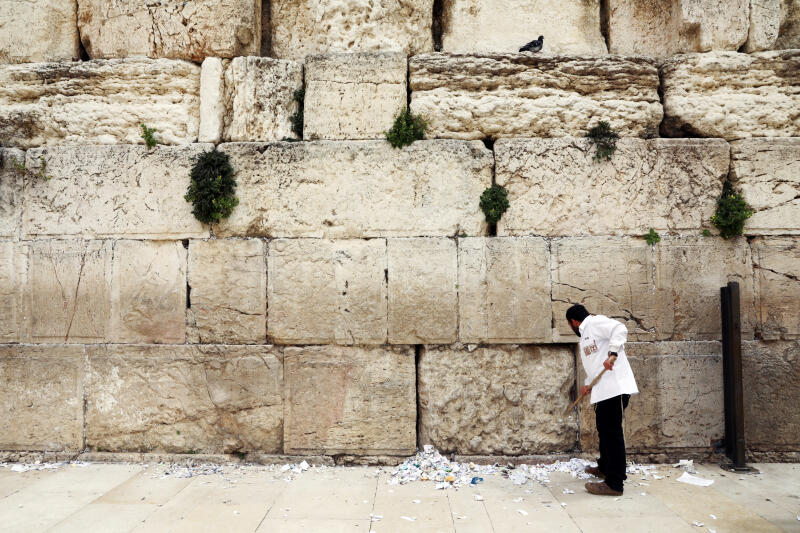 A man clears notes in Jerusalem's Old City on March 31, 2020.