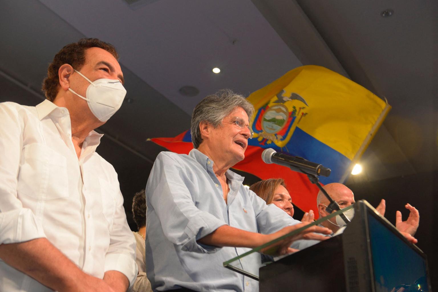 Ecuadorean presidential candidate Guillermo Lasso (right) speaks to the press as he celebrates his victory, on April 11, 2021.
