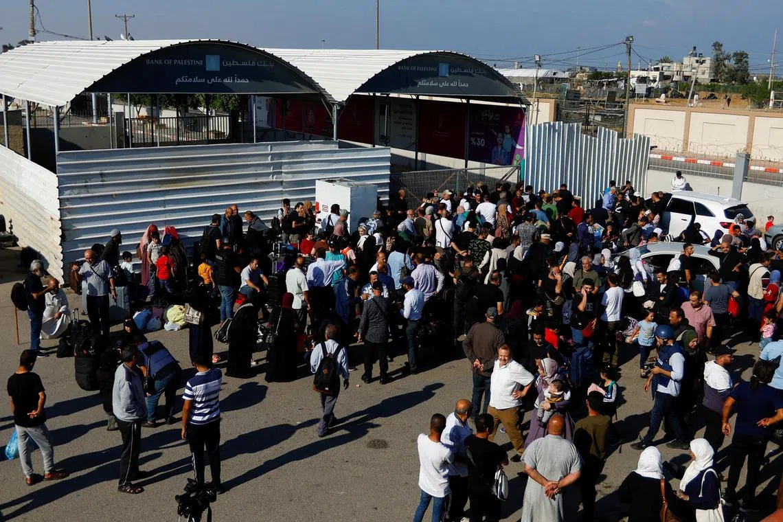 Palestinians with dual citizenship gathering outside the Rafah border crossing with Egypt on Oct 16.