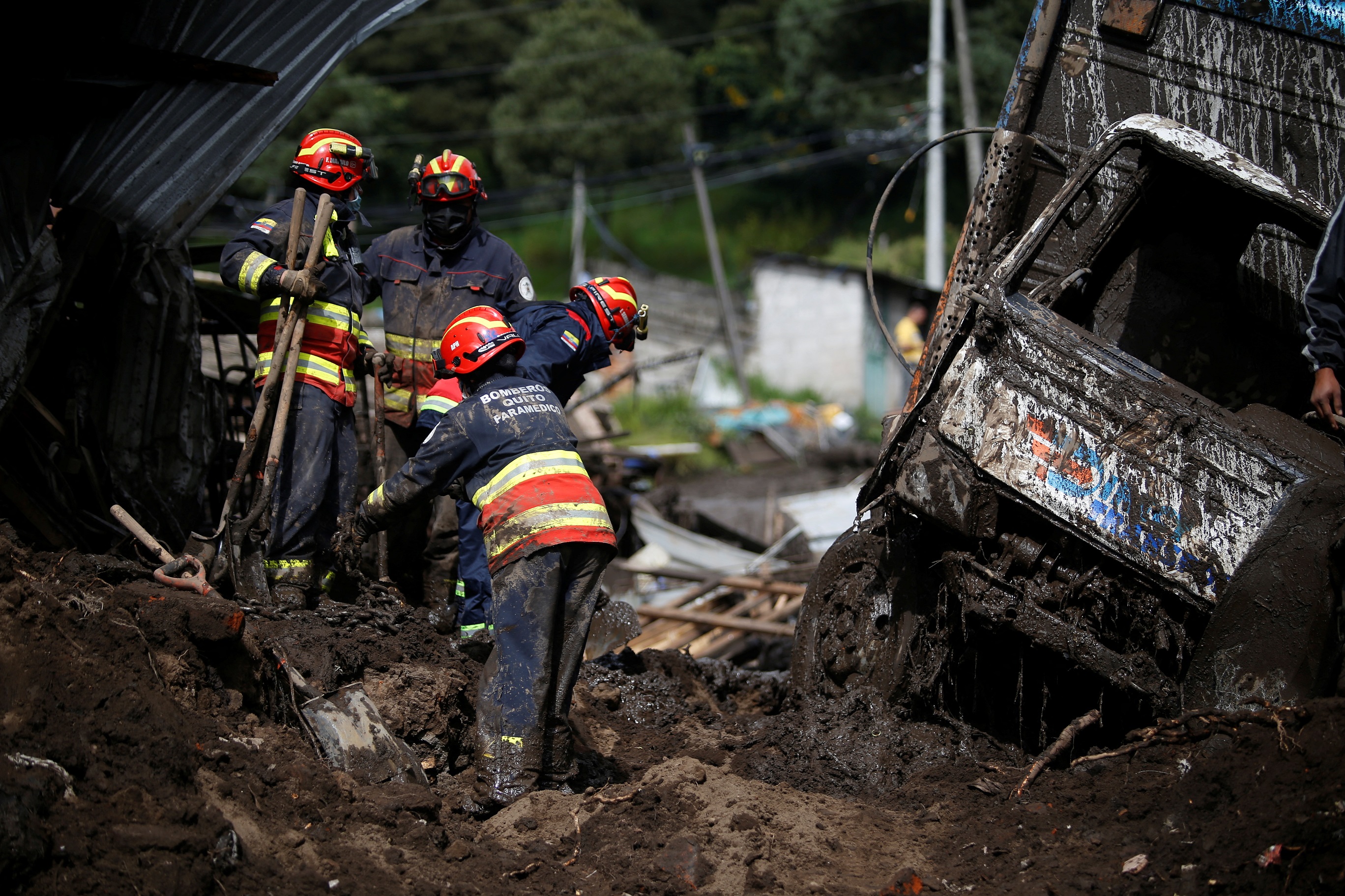 Firefighter rescue crews are seen as they continue searching homes and streets covered by mud in Quito. PHOTO: REUTERS