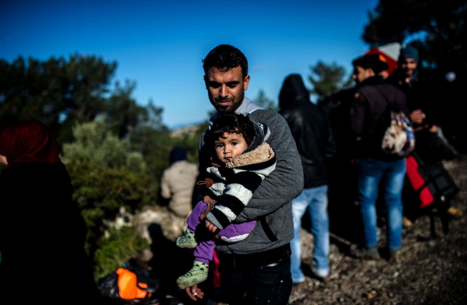 A Syrian father detained by Turkish soldiers holds his child as he tries to reach the Greek island of Lesbos, near the village of Dikili, western Turkey, on March 5, 2016.