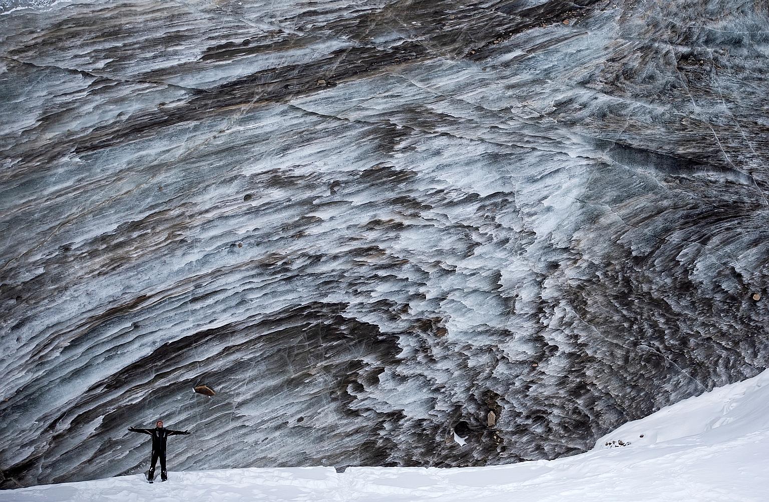 A tourist posing for a picture on the Bogdanovich glacier, 3,500m above sea level, located in the Tian Shan mountain range, last Saturday.