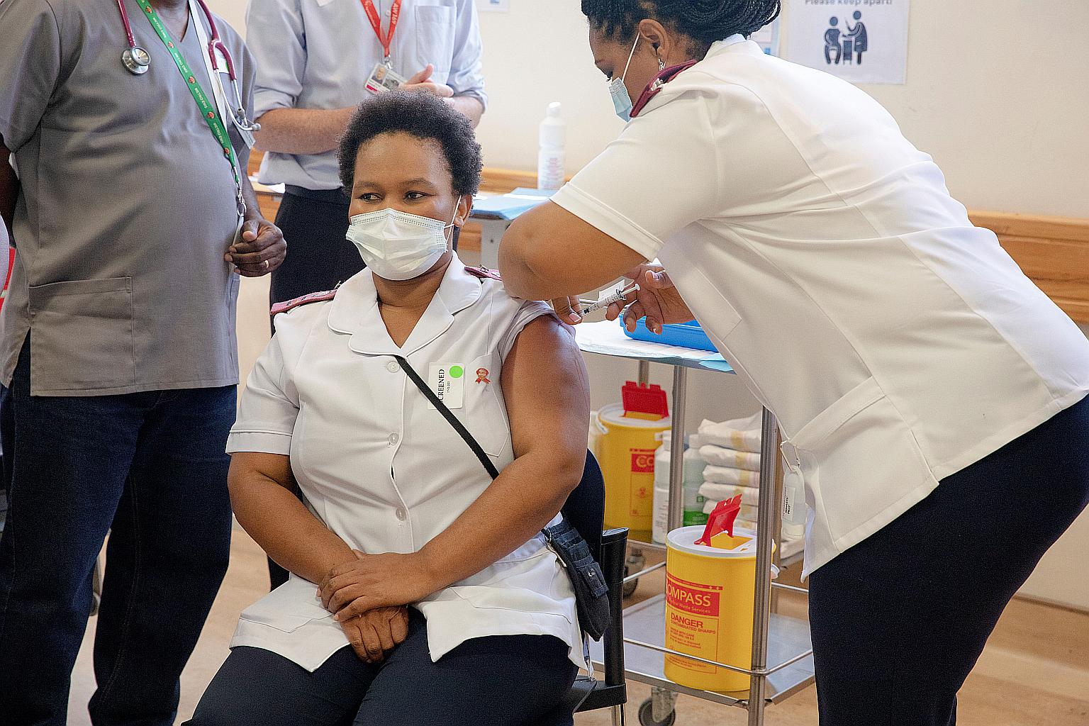 A South African health worker receives a Covid-19 vaccine at the Khayelitsha Hospital near Cape Town on Feb 17, 2021.