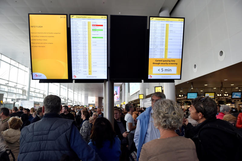 Passengers wait during a strike by Aviapartner baggage handlers at Brussels-Zaventem international airport in Belgium, Oct 27, 2018.