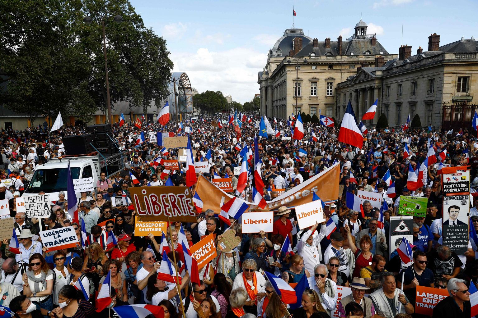 Protesters holding French flags and signs reading 'Freedom' take part in a rally in Paris, on Aug 28, 2021, against the Covid-19 health pass and mandatory vaccinations.