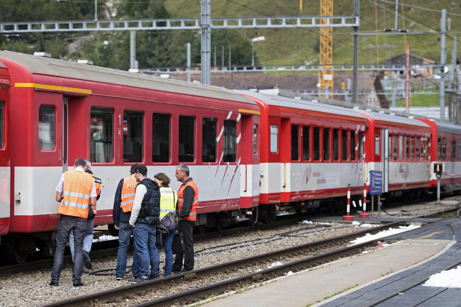 Police staff inspects a crashed train at the Andermatt train station in the Canton of Uri, Switzerland, on Sept 11, 2017.