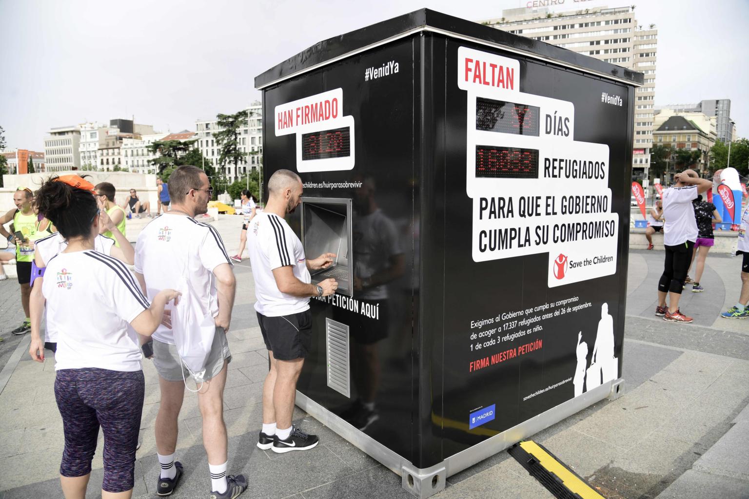 A man sings a petition at an electronic counter installed by Save the Children in Madrid.