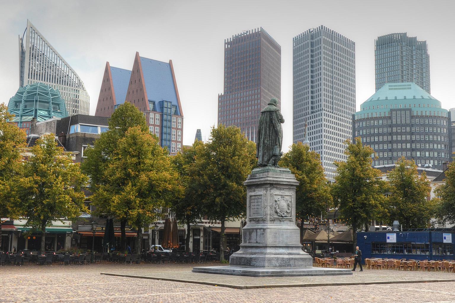 Het Plein, a famous town square in the The Hague, is photographed with the city's skyline in the background.