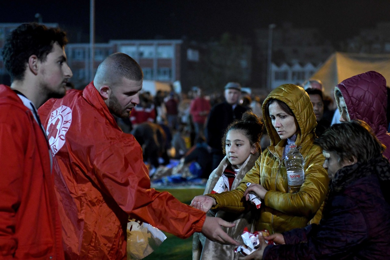 <p>People receive food as they take shelter in a camp at the soccer stadium in Durres on November 26, 2019, after the strongest earthquake in decades claimed at least 20 lives, with victims trapped in the debris of toppled buildings. - Albanian rescuers dug through rubble as desperate survivors trapped in toppled buildings cried out for help on November 26, 2019, after the strongest earthquake in decades killed at least 16 people and left hundreds injured. The 6.4 magnitude quake struck before dawn at 3:54 am local time (0254 GMT), with an epicentre 34 kilometres (about 20 miles) northwest of the capital Tirana, according to the European-Mediterranean Seismological Centre. (Photo by Gent SHKULLAKU / AFP)</p>