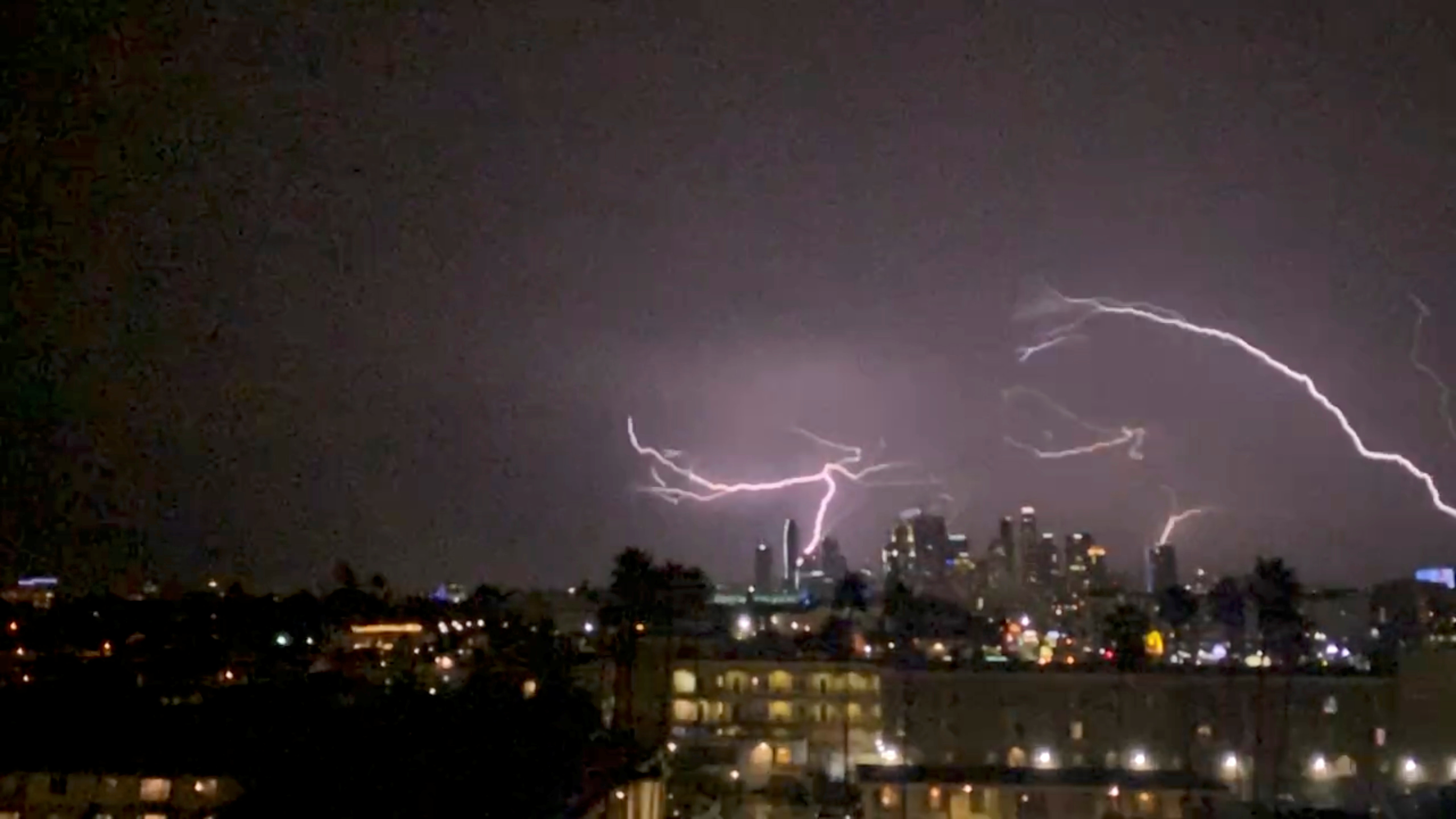 In a photo taken on Oct 4, 2021, a lightning strike is pictured over Los Angeles, California, US.
