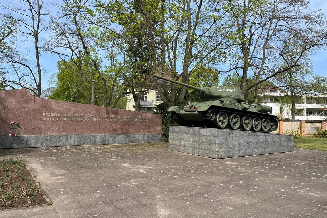 A Russian tank exhibit located next to the entrance of the German-Russian Museum.