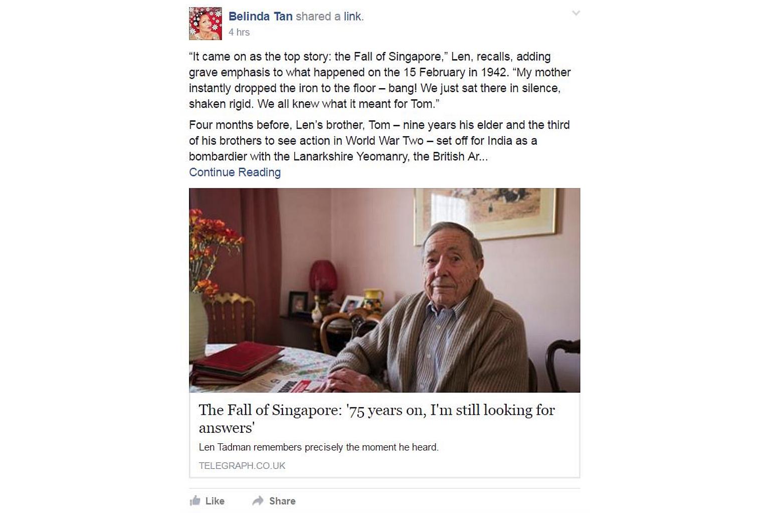 A Facebook post about Mr Len Tadman, a Briton who spent the past 75 years trying to find information about his brother Tom who died defending Singapore in World War Two.