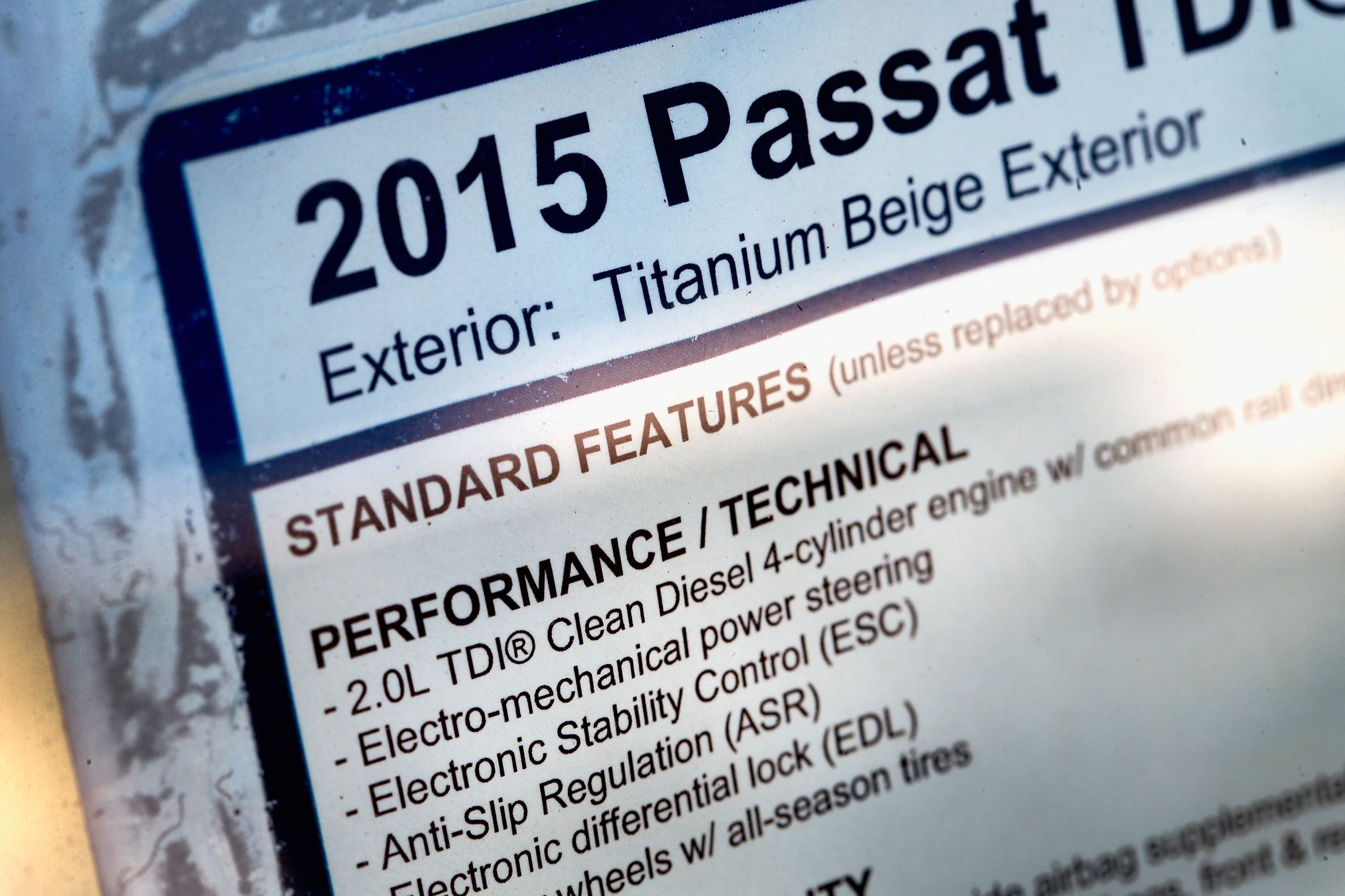 A 2015 Volkswagen Passat with the TDI clean diesel motor is offered for sale at a US dealership.