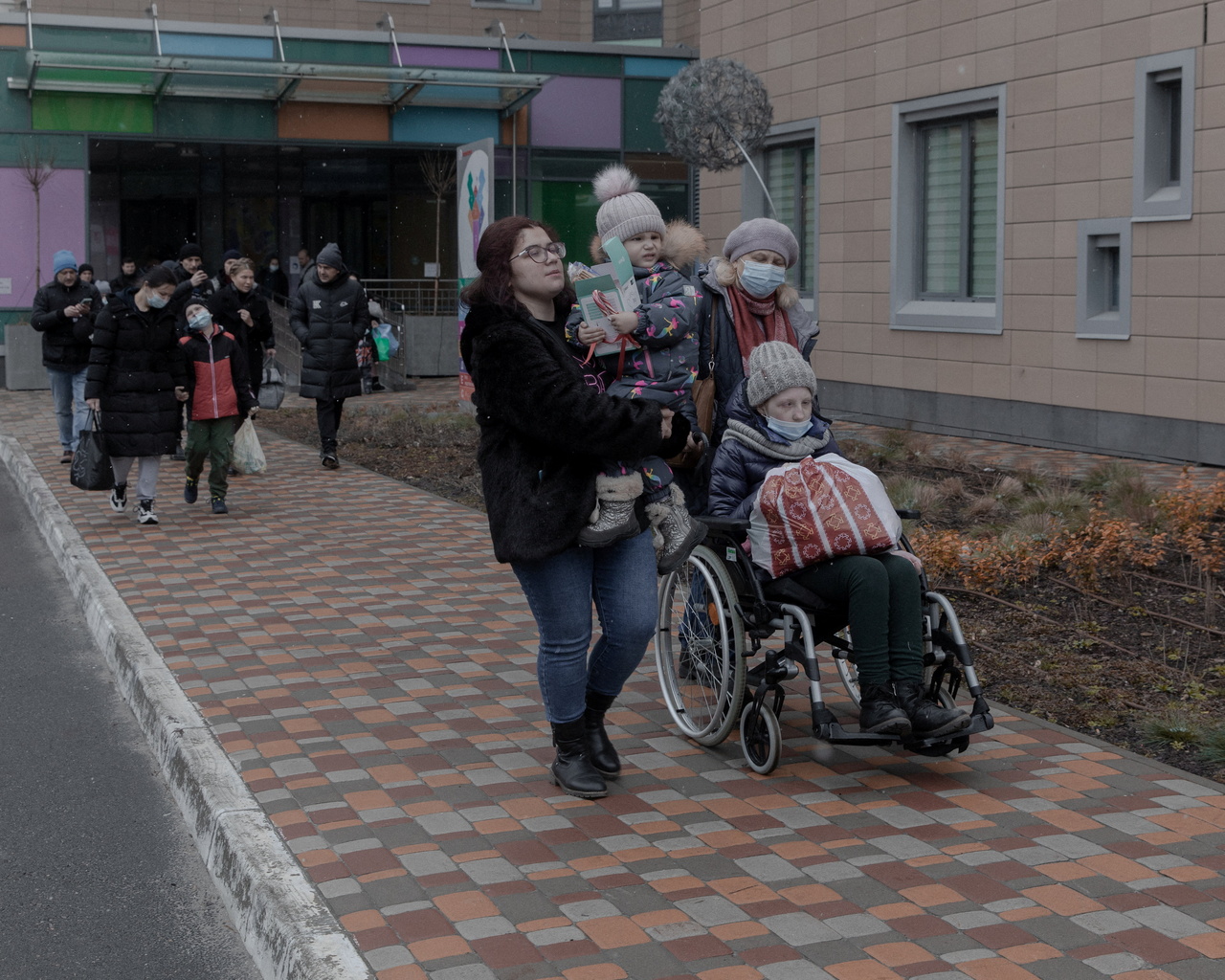 Patients of a children's hospital are taken to a bus headed to Poland, in Kyiv on March 2, 2022.