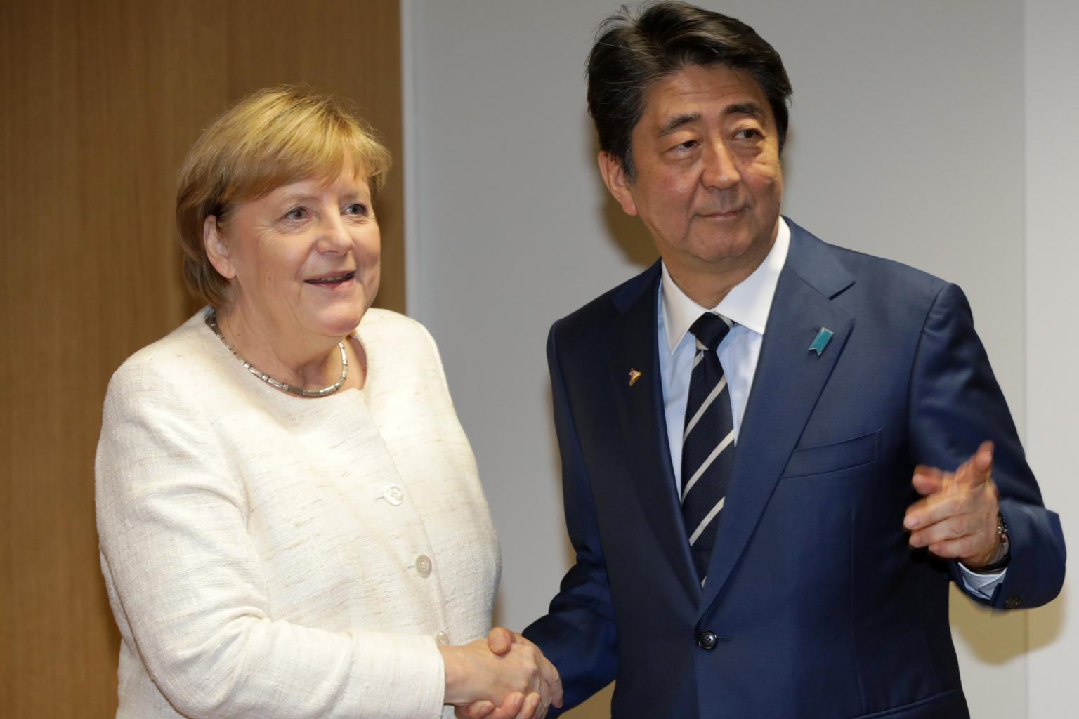 Japan's Prime Minister Shinzo Abe with German Chancellor Angela Merkel on the sidelines of the Asem leaders summit in Brussels, Belgium, on Oct 18, 2018.