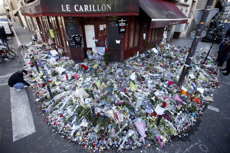 People mourn outside Le Carillon restaurant a week after a series of deadly attacks in the French capital Paris, on Nov 22, 2015.