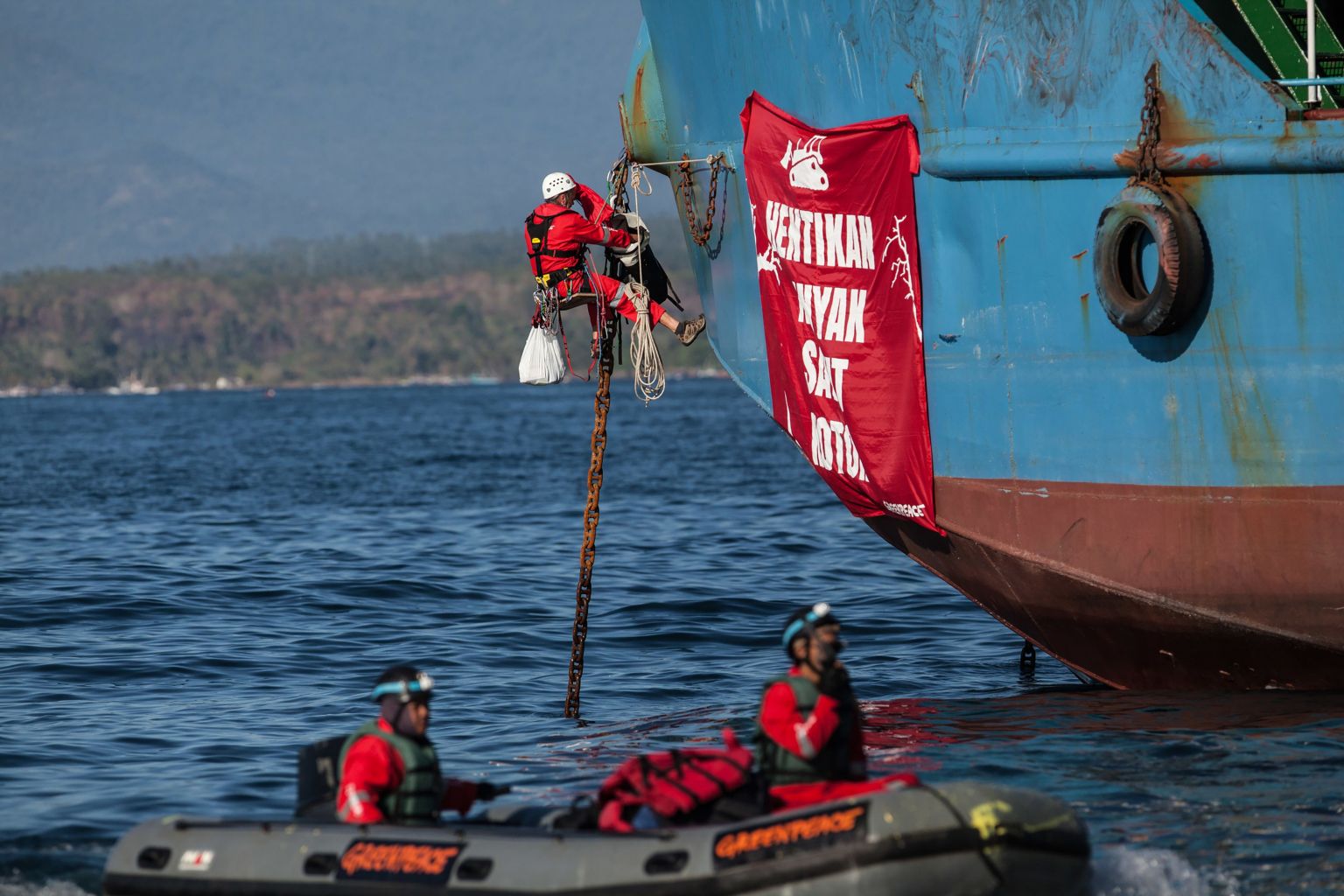 Greenpeace activists climbing aboard a tanker to hang a banner reading "Stop Dirty Palm Oil" in Indonesian at the Wilmar International refinery in Bitung, North Sulawesi, in September 2018.