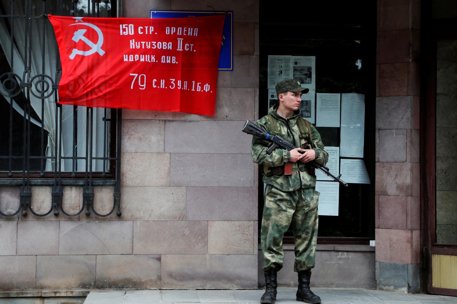 A service member of pro-Russian troops stands guard outside a building in Svitlodarsk in the Donetsk region on May 25, 2022.