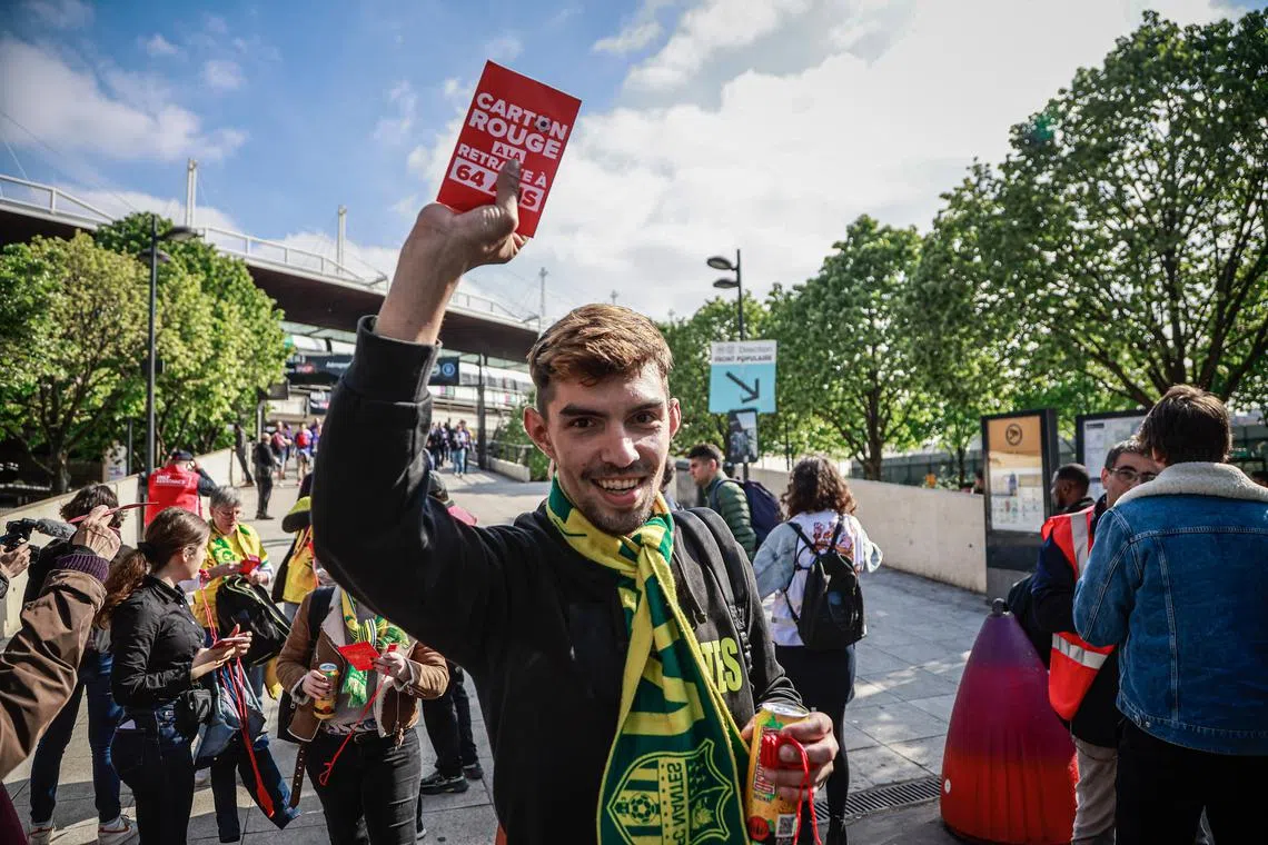 An FC Nantes’ supporter holding up a red card that was given out by members of the Unions opposed to the pension reform, ahead of the French Cup final between Nantes and Toulouse in Paris on April 29.