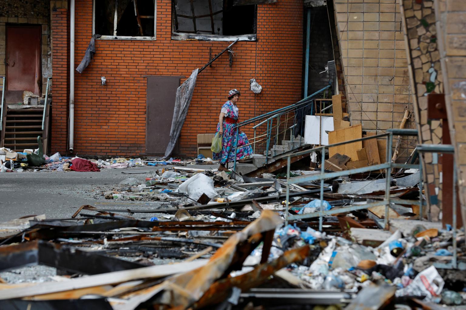 A woman walks outside a damaged apartment building in Mariupol on Aug 21, 2022.