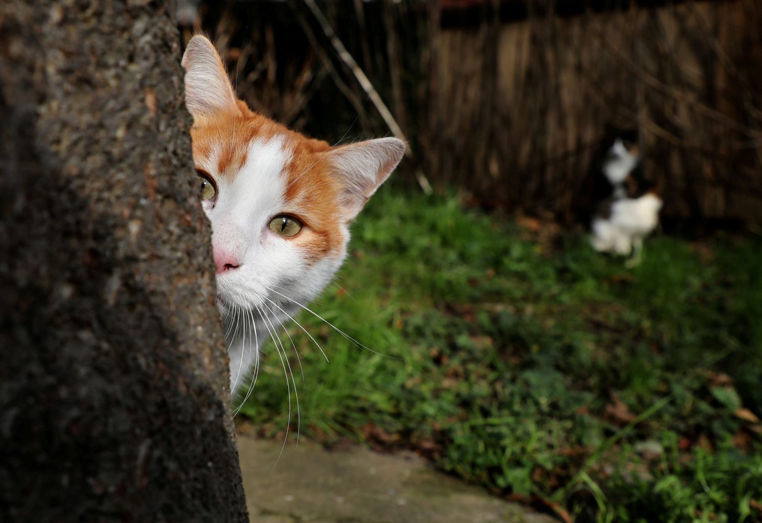 A cat sits behind a tree in Istanbul, Turkey, in January 2018.