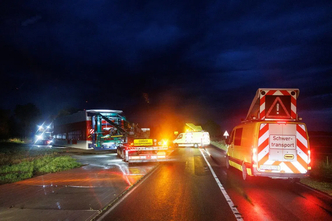 A nacelle of a wind turbine on a truck in a convoy with escort vehicles near a wind farm in Biegen, Germany, on Aug 31.