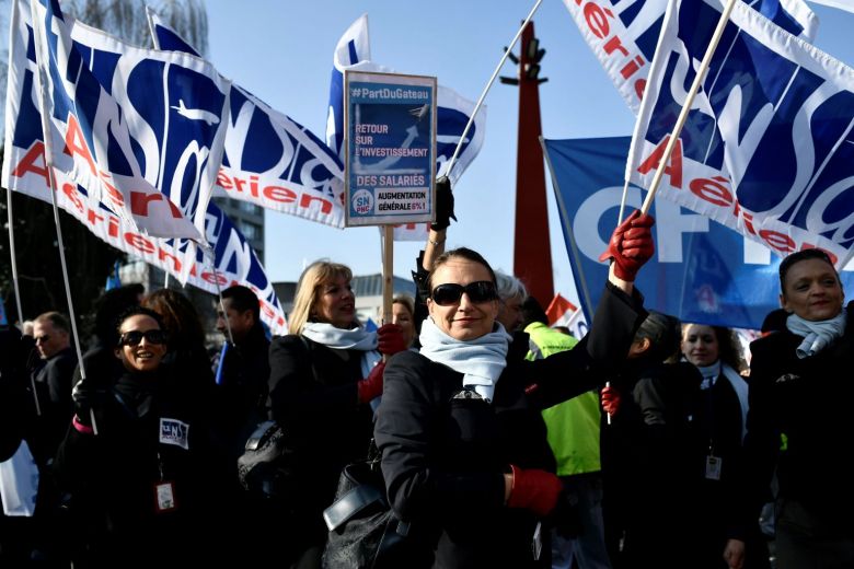Striking Air France employees hold union flags at Charles de Gaulle airport.