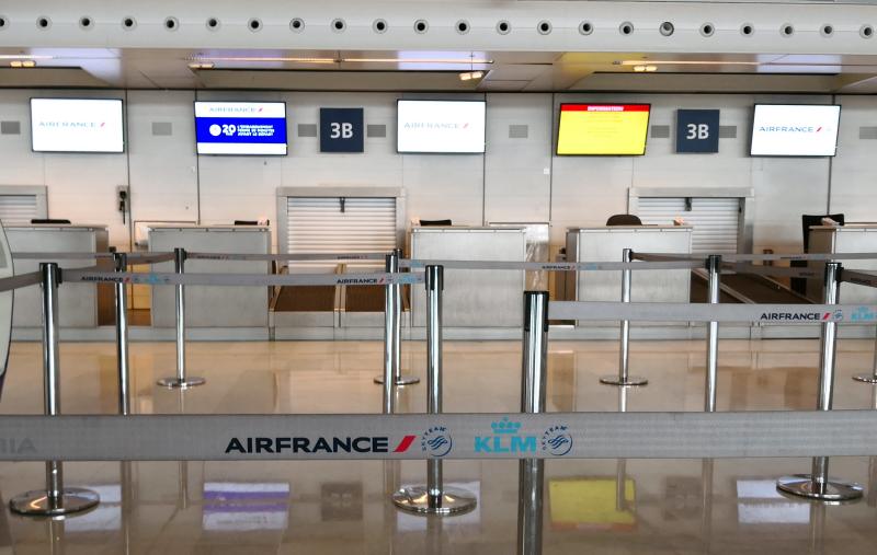 Empty Air France check-in desks are seen in Charles de Gaulle airport in Roissy, outside Paris, during a national Air France strike on March 23, 2018.