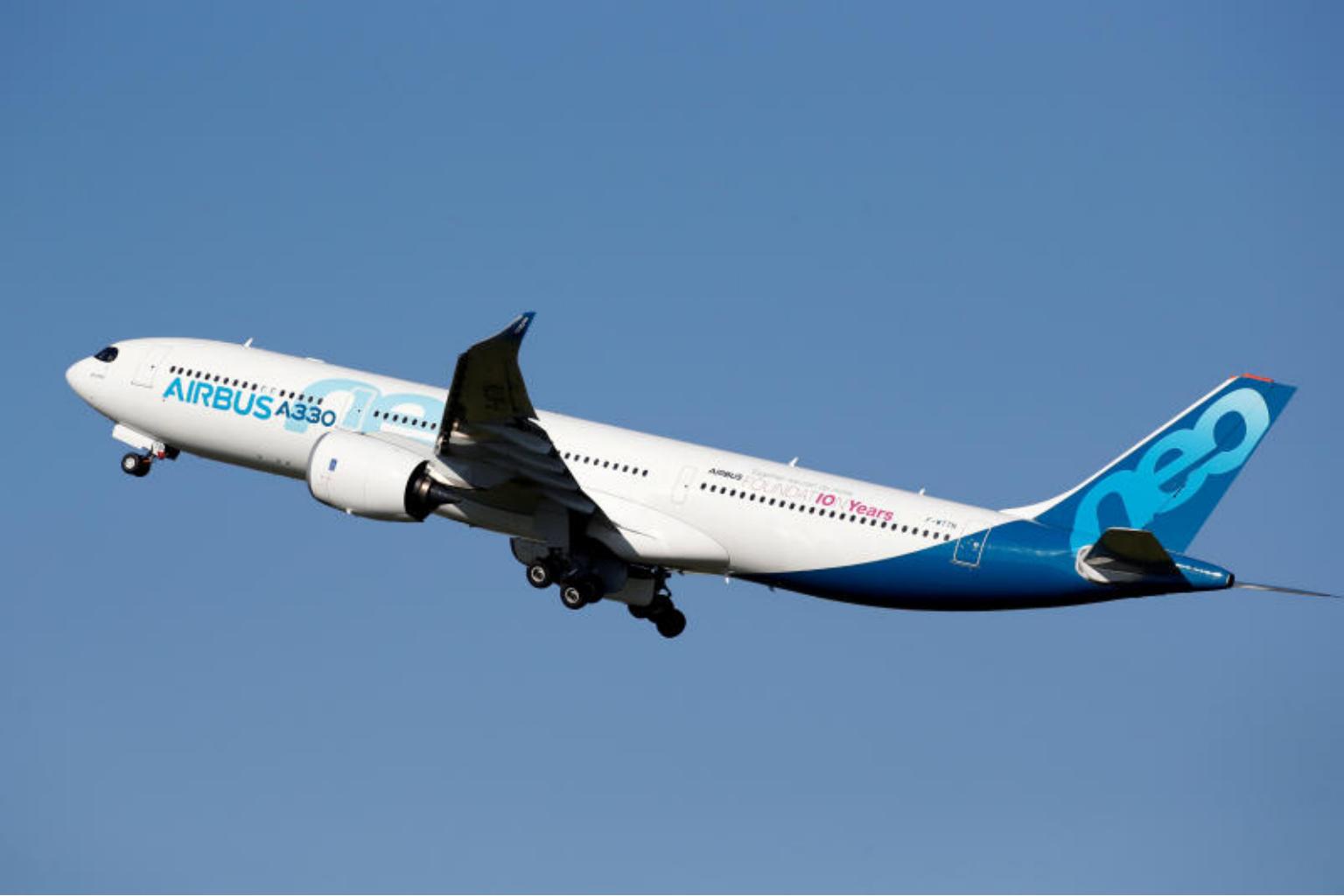 A photo taken on March 20 shows an Airbus A330neo taking off from the Airbus delivery centre in Colomiers, France.