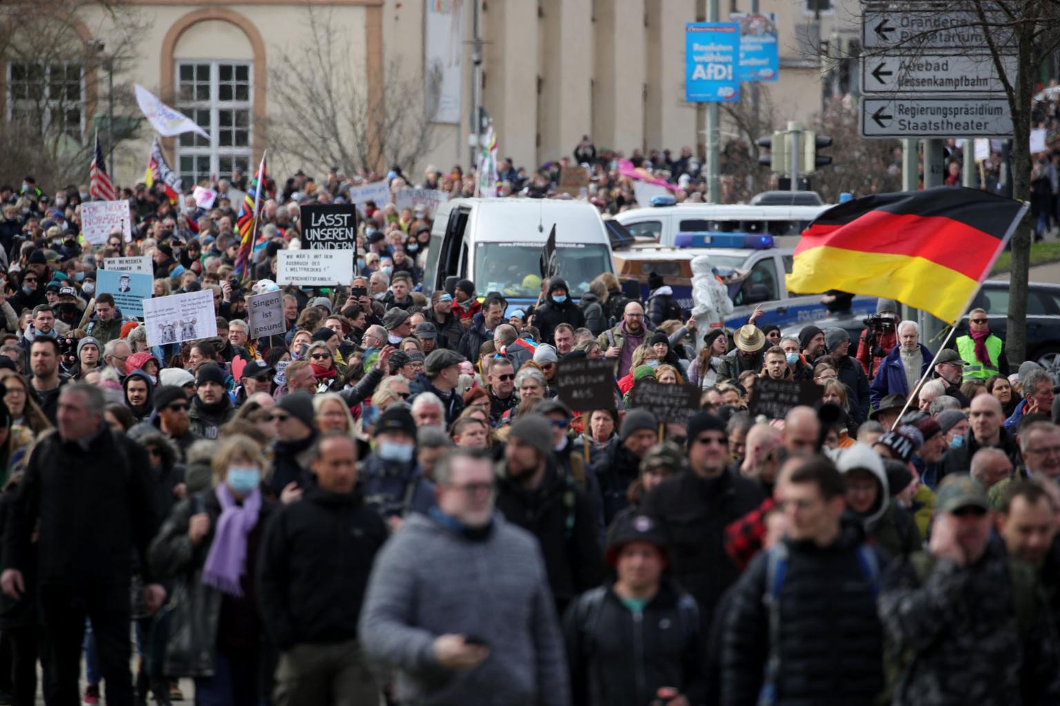 In a photo taken on March 20, 2021, protestors take part in a march demanding the compliance of basic rights in Kassel, central Germany.