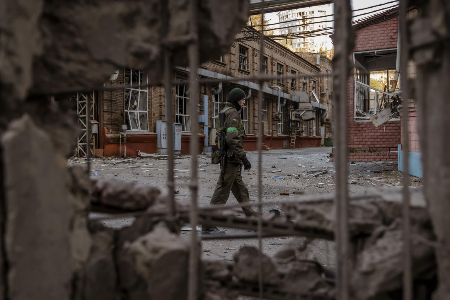 A Ukrainian soldier walks through an area damaged after an overnight Russian missile strike in central Kyiv, on April 29, 2022.