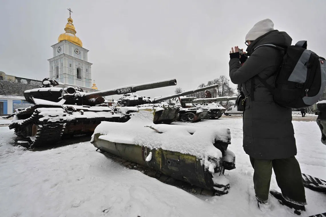 A young woman takes a picture of destroyed Russian tanks covered with snow, in Ukraine’s capital Kyiv, on Dec 12, 2022.