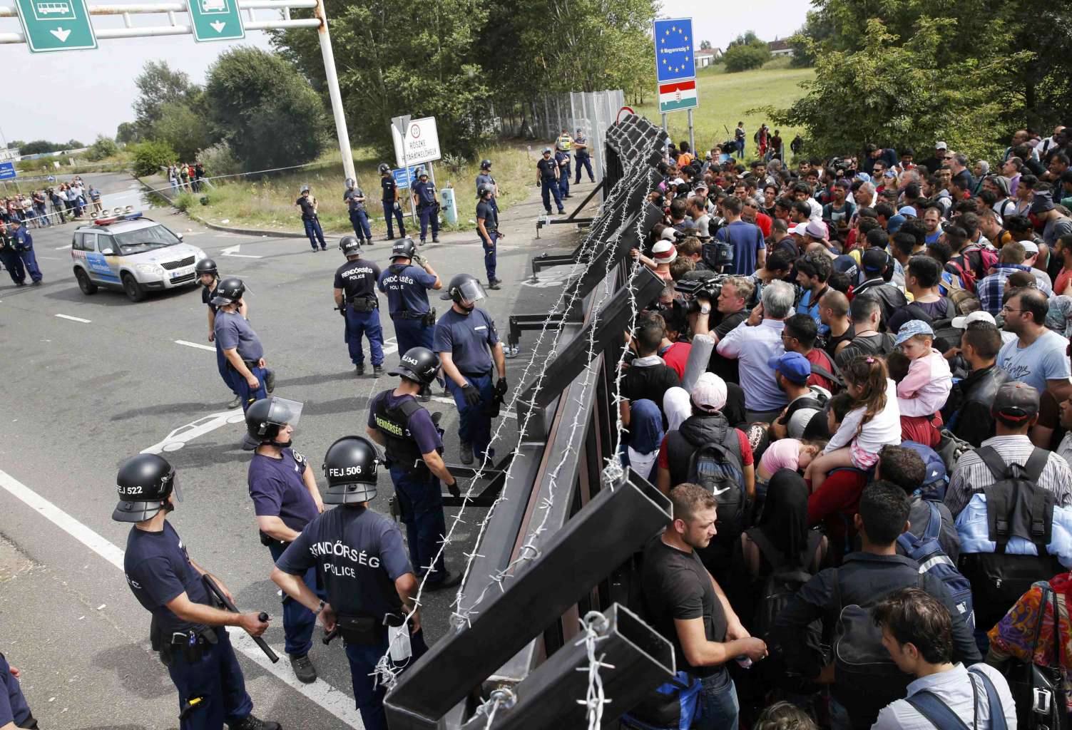HORGOS, Serbia (AFP) - Hundreds of desperate migrants were Tuesday trapped behind a razor-wire fence erected by Hungary, as Germany's Angela Merkel called for an EU summit on the refugee crisis.